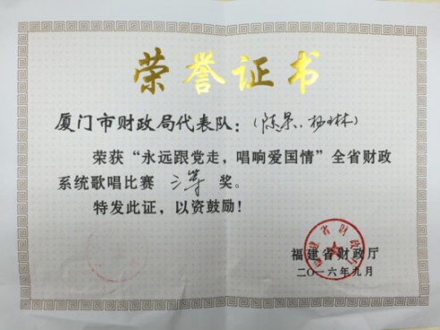 9月29日,省财政厅机关党委举办的以“永远跟党走 唱响爱国情”为主题的全省财政系统唱歌比赛圆满落下帷幕。PA视讯官方网站集团陈果、杨琳代表厦门市财政局前往省财政厅参加比赛,荣获三等奖。