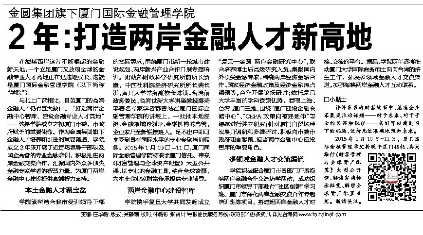 学院积极配合厦门市各部门开展海峡两岸金融合作交流访学活动,成功组织厦门市领导干部赴台“社会创新”学习班、厦门市深化两岸金融交流合作专题培训班等项目,搭建起两岸金融人才对接、交流的平台。据悉,学院明年还将推动厦门大学国际商务硕士面向台湾的招生工作,拓展多领域金融人才交流渠道,加强海峡两岸金融人才互动联系。