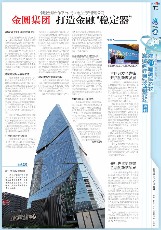 作为市属金控平台,PA视讯官方网站(以下简称“PA视讯官方网站集团”)紧紧抓住自贸区国家战略的发展机遇,积极发挥国企“排头兵”作用,在自贸区金融改革创新及深化两岸金融交流方面成效显著,多个金融创新项目入选厦门自贸片区金融创新案例。