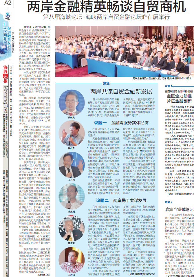 引人注目的不只有欧洲杯赛场,还有福建自贸试验区厦门片区这片“球场”。昨日,海峡两岸金融界大咖、学者、企业家、市民汇聚一堂,在2016年海峡两岸(厦门)自贸金融论坛主题沙龙上,嘉宾们从厦门片区揭牌以来上演的38个精彩“进球”即取得的38项金融创新谈起,聊自贸金融,话两岸发展,共同期许两岸携手的下一个精彩“进球”。
