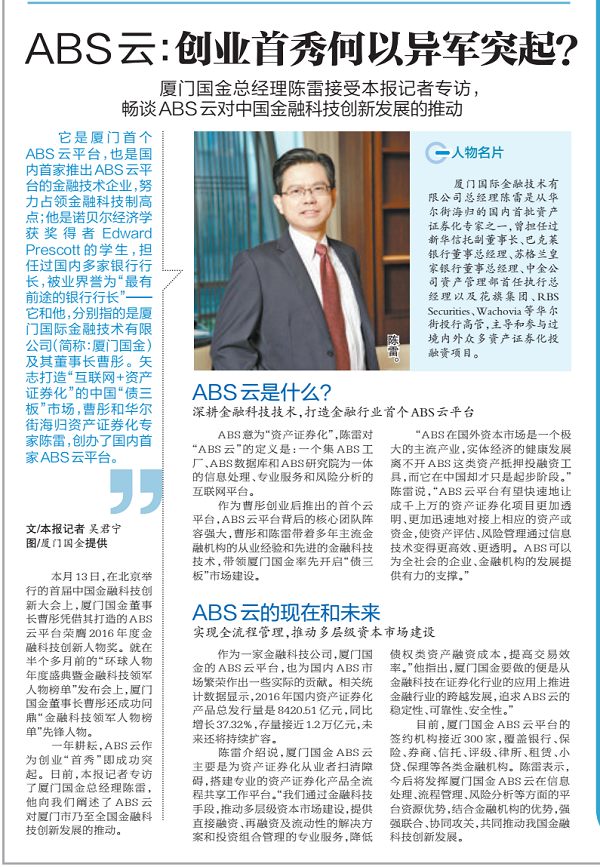 一年耕耘,ABS云作为创业“首秀”即成功突起。日前,本报记者专访了厦门国金总经理陈雷,他向我们阐述了ABS云对厦门市乃至全国金融科技创新发展的推动。
