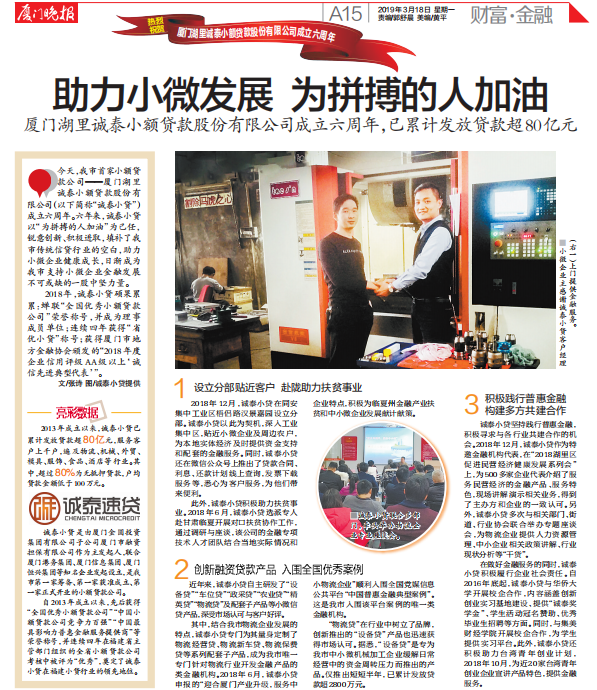 今天,我市首家小额贷款公司——厦门湖里诚泰小额贷款股份有限公司(以下简称“诚泰小贷”)成立六周年。六年来,诚泰小贷以“为拼搏的人加油”为己任,锐意创新、积极进取,填补了我市传统信贷行业的空白,助力小微企业健康成长,日渐成为我市支持小微企业金融发展不可或缺的一股中坚力量。