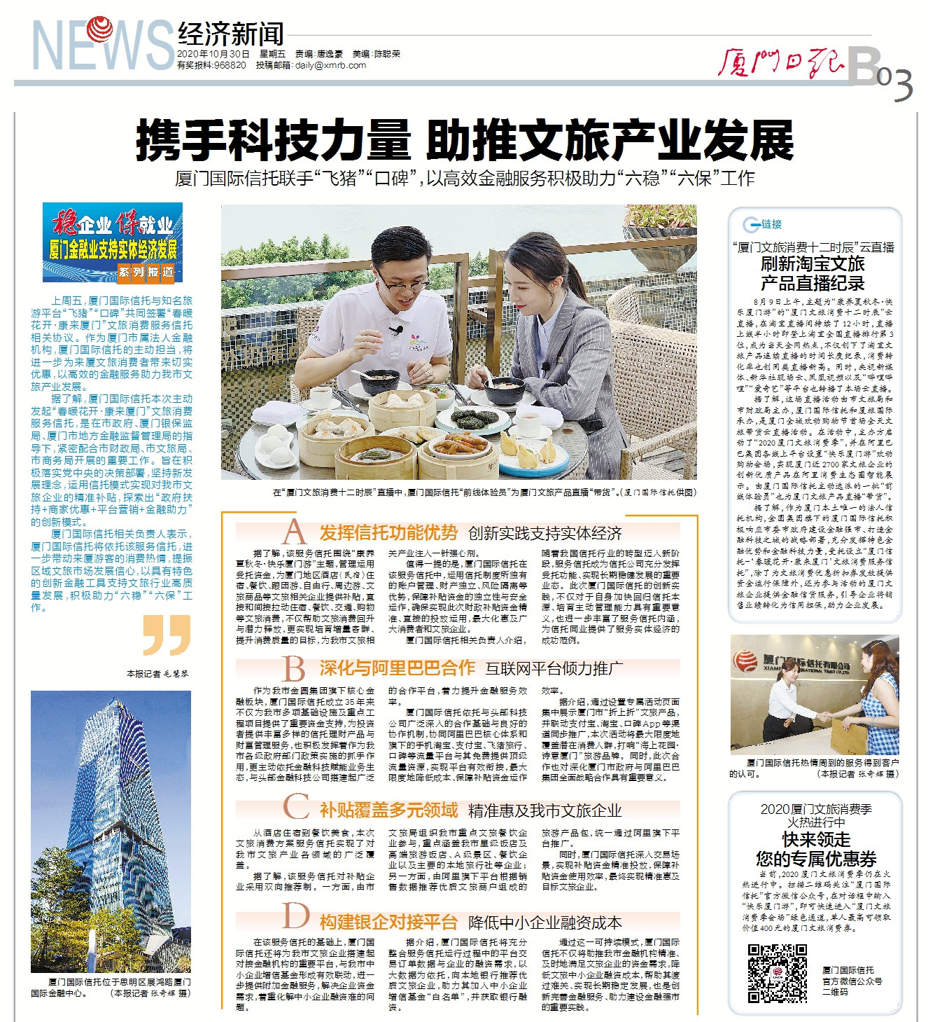 据了解,这场直播活动由市文旅局和市财政局主办,厦门国际信托和厦旅国际承办,是厦门全城欢动购物节首场全天文旅带货云直播活动。在活动中,主办方启动了“2020厦门文旅消费季”,并在阿里巴巴集团各线上平台设置“快乐厦门游”欢动购物会场,实现厦门近2700家文旅企业的创新优质产品在阿里消费生态圈智能展示。由厦门国际信托主动选派的一批“前线体验员”也为厦门文旅产品直播“带货”。