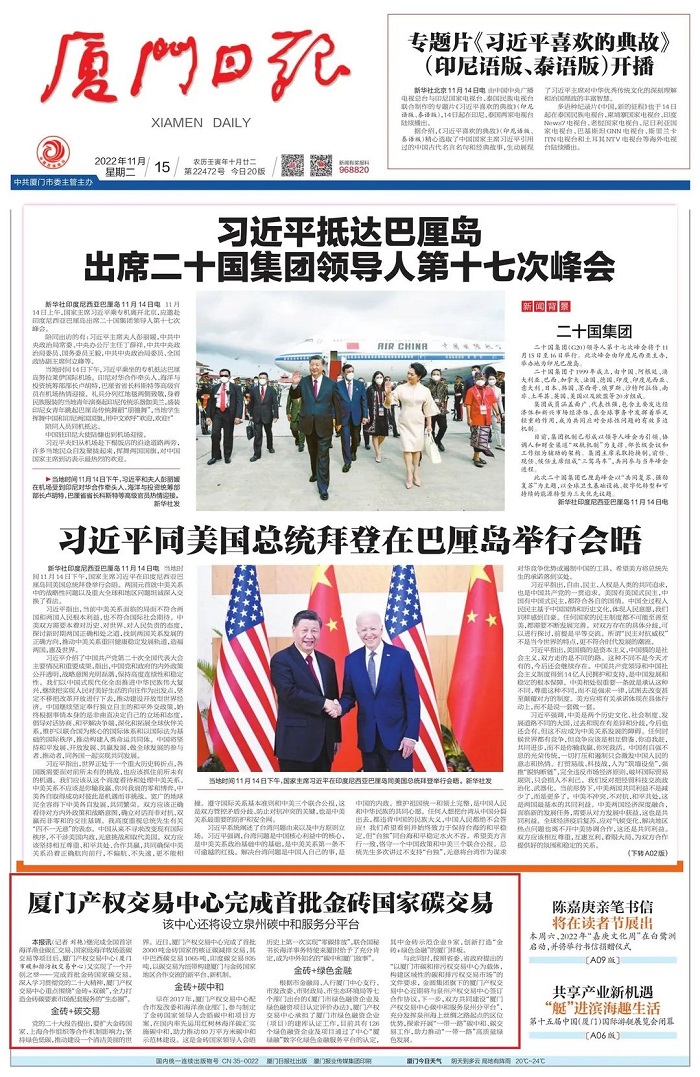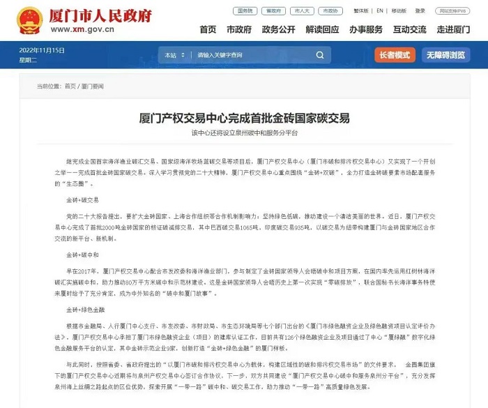 11月15日,《厦门日报》头版刊文报道厦门产权交易中心完成首批金砖国家碳交易。