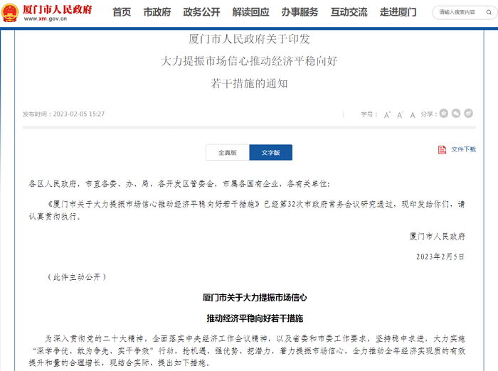 《厦门市关于大力提振市场信心推动经济平稳向好若干措施》