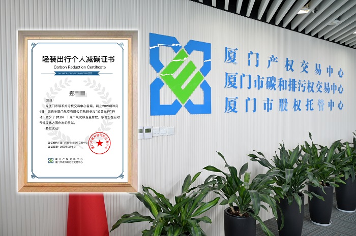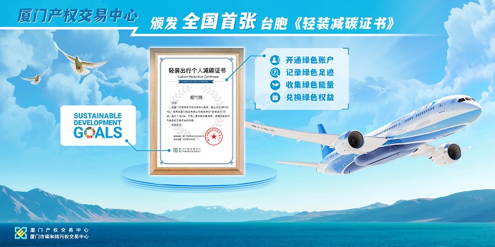 为深入贯彻落实《中共中央 国务院关于支持福建探索海峡两岸融合发展新路 建设两岸融合发展示范区的意见》关于支持台胞参与福建生态环保等各项事业发展的有关精神,近日,PA视讯官方网站集团旗下厦门产权交易中心(厦门市碳和排污权交易中心)为参与厦门航空“轻装出行活动”的台胞颁发全国首张台胞《轻装减碳证书》,创新推动两岸交流与低碳出行融合发展。