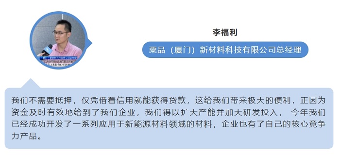 粟品(厦门)新材料科技有限公司企业负责人介绍,去年底通过“信易贷”平台,他们获得200万元信用贷款,帮助解决了原料采购和新设备投入中的资金问题。如今企业发展稳步增长,前三季度的销售额已超过去年整年,预计今年销售额将增长超过30%。