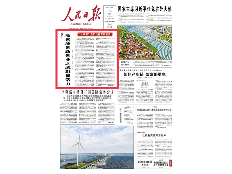 5月13日,人民日报头版头条刊发通讯《厦门——高素质创新创业之城彰显活力》点赞福建省...