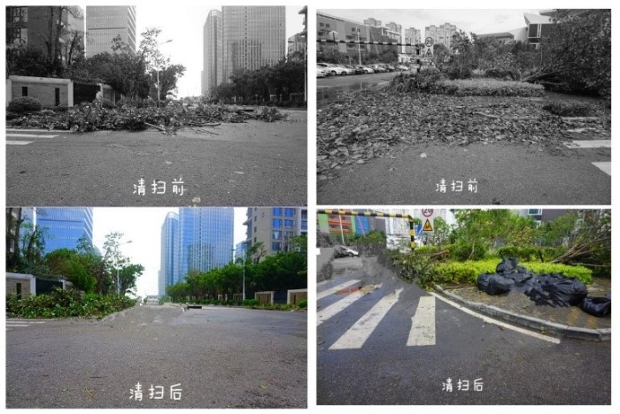 8时30分起,志愿者服务队三十余人即顶着台风后的炎炎烈日和高温酷暑,分队奔赴相关区域。台风过后,大楼周边的道路受台风影响,城市绿化大量折断、倾倒,枯枝落叶浸泡水中,严重影响道路交通的正常运行。志愿者们齐心协力,将杂物搬离车道并将垃圾清扫装袋,迅速恢复道路和人行道的畅通。