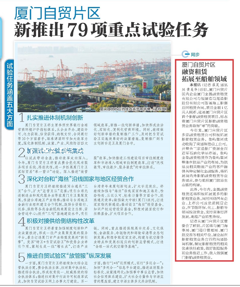 记者从厦门自贸片区管委会了解到,片区将与厦门海事局、厦门港口管理局、厦门航交所等相关单位,建立起在船舶租赁业务方面的沟通协调机制,制定船舶租赁的相关优惠扶持政策,做好跟踪服务和业务推进工作,做大做强厦门船舶融资租赁业。
