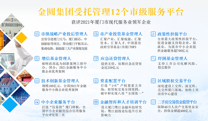 在今年2月的厦门市企业家大会上,集团荣获“厦门市现代服务业领军企业”,参与投资的厦门天马微电子、联芯集成电路入选“厦门市先进制造业领军企业”。厦门市产业投资基金投资及合作的家乡互动、青瓷文化、亿联网络、吉比特、美亚柏科入选“厦门市新经济领军企业”,厦门钨业入选“厦门市先进制造业领军企业”。